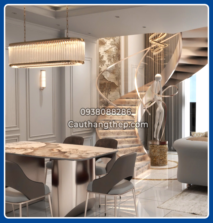 • Kiến trúc mềm mại, uyển chuyển: bậc thang xoắn quanh trục trung tâm, tạo sự sang trọng và độc đáo.