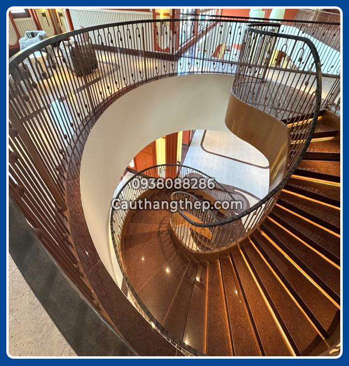 Cầu thang xoắn ốc là kiểu cầu thang có thiết kế các bậc thang xoay quanh một trục đứng (cột trung tâm), tạo dạng hình xoắn trôn ốc từ dưới lên trên. Toàn bộ cầu thang được bố trí theo dạng vòng tròn hoặc elip, giúp tiết kiệm diện tích tối đa và tạo điểm nhấn kiến trúc nổi bật cho không gian. Các bậc thang được sắp xếp theo vòng xoắn, tạo thành đường đi uyển chuyển, khác biệt so với cầu thang thẳng truyền thống.
