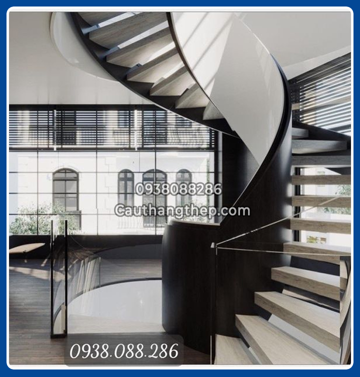• Thiết kế điêu khắc: Các mẫu cầu thang xoắn ốc bằng thép, kính, hoặc gỗ cao cấp tạo cảm giác như một tác phẩm nghệ thuật.