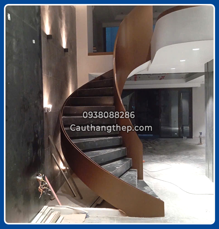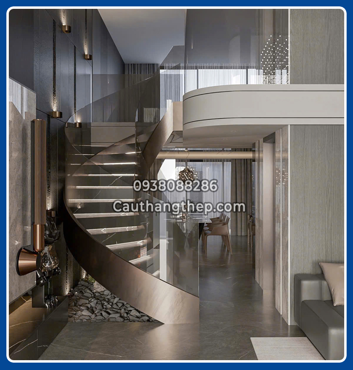 • Lan can & tay vịn: Được thiết kế theo đường cong của cầu thang, vừa đảm bảo an toàn vừa tăng tính thẩm mỹ.