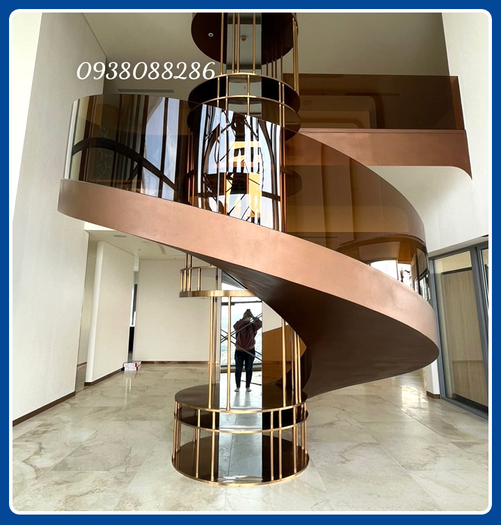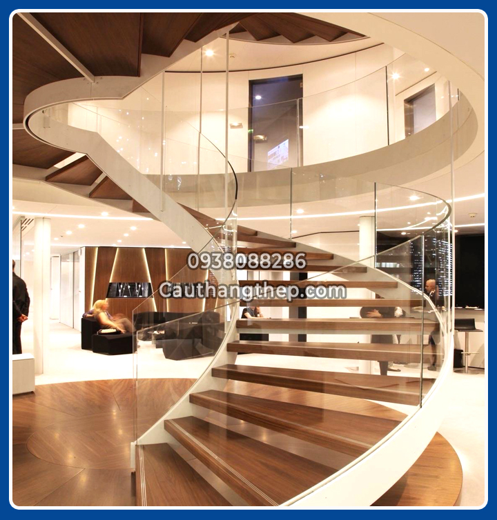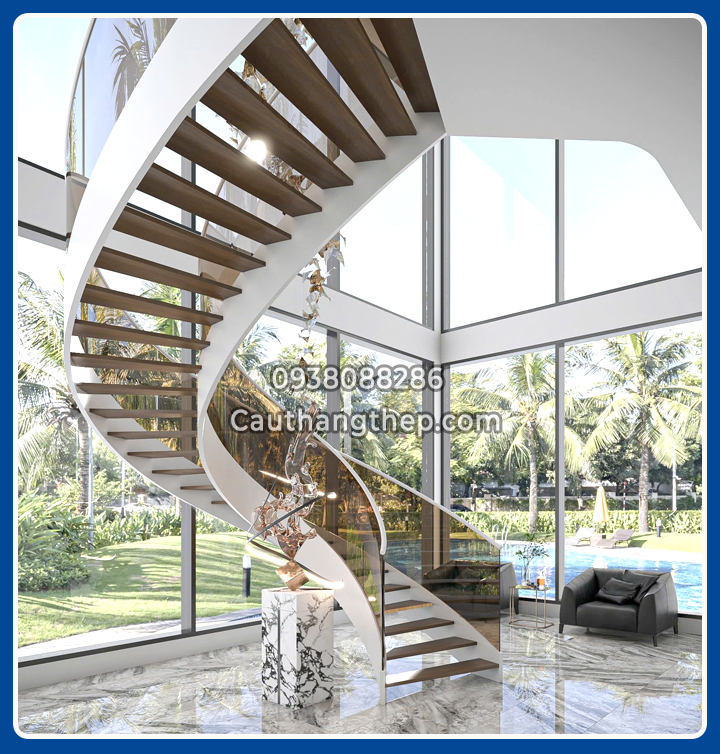 • Bậc cầu thang: Các bậc xoay quanh trục, tạo hình đồng đều, có thể làm bằng gỗ, thép, inox, kính hoặc bê tông.