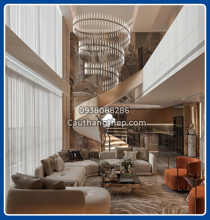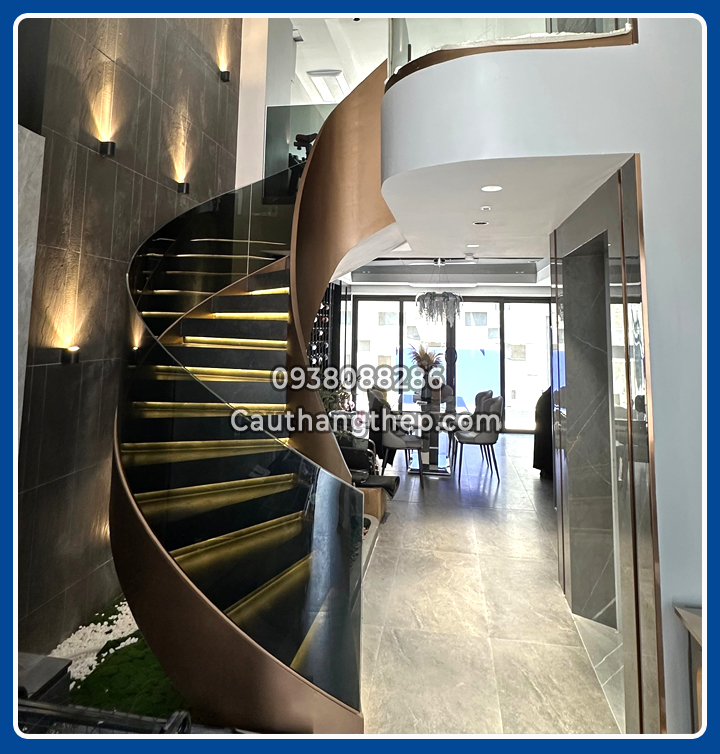 - Tạo điểm nhấn độc đáo: Thiết kế uốn lượn mềm mại của cầu thang xoắn ốc biến một khu vực chức năng thông thường thành một tác phẩm nghệ thuật, tạo ấn tượng mạnh cho khách đến thăm.
