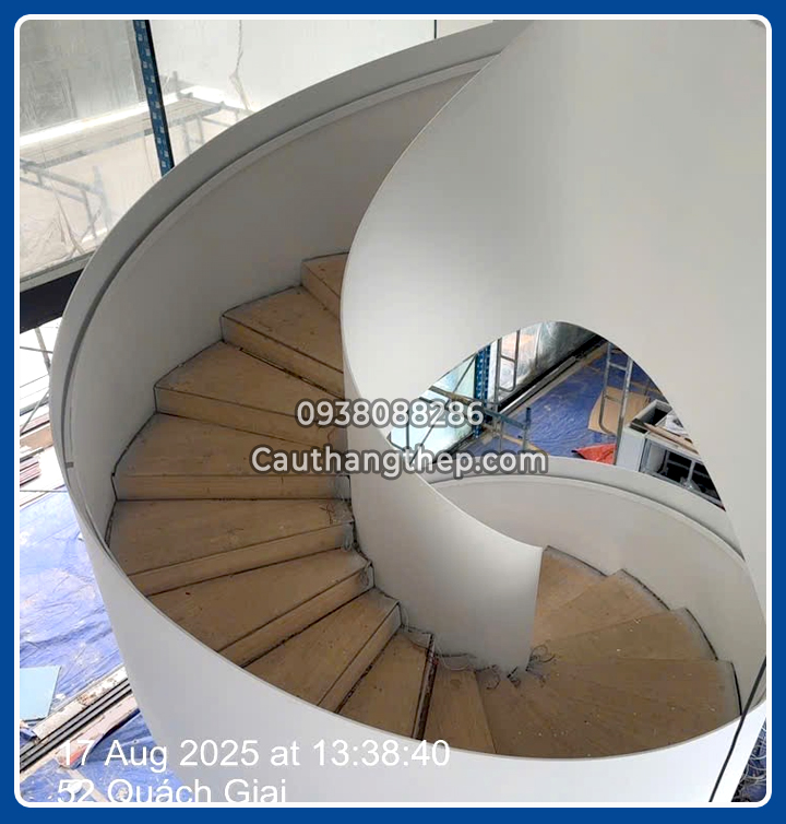 - Bậc thang: Các bậc được gắn trực tiếp vào trụ chính, xếp so le xoay quanh trục, tạo thành vòng xoắn. Chất liệu có thể là gỗ, sắt, thép, kính cường lực hoặc đá.