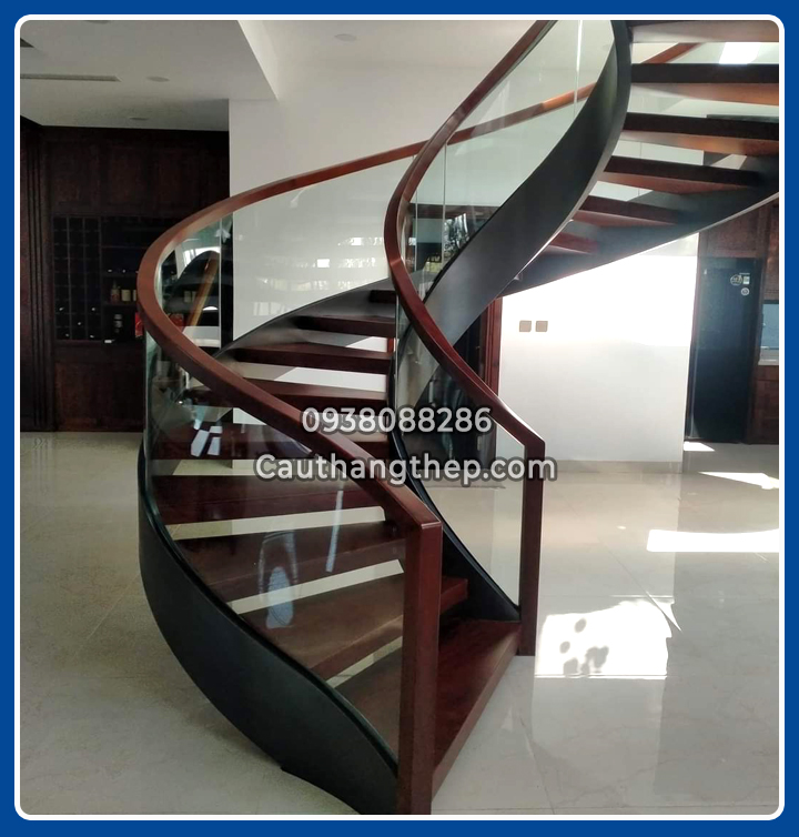 • Cầu thang xoắn ốc bằng gỗ kết hợp kính cường lực: Sự kết hợp giữa gỗ tự nhiên và kính cường lực tạo nên vẻ đẹp sang trọng, ấm cúng, phù hợp với biệt thự và penthouse.