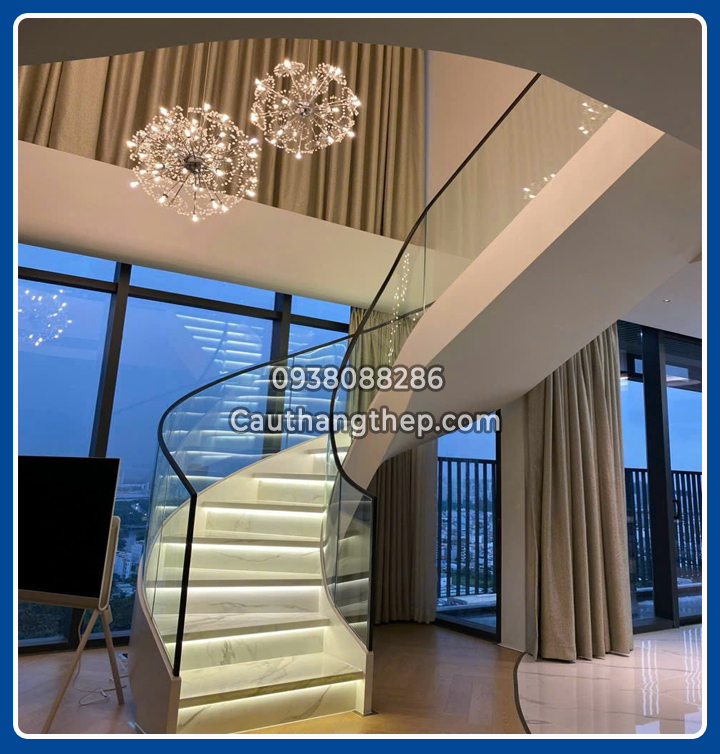 • Cầu thang xoắn inox – kính cường lực: Tạo không gian thoáng – hiện đại: kết hợp kính trong suốt và inox sáng bóng. Lan can kính còn giúp tận dụng ánh sáng tự nhiên và tạo cảm giác sang trọng tinh tế.
