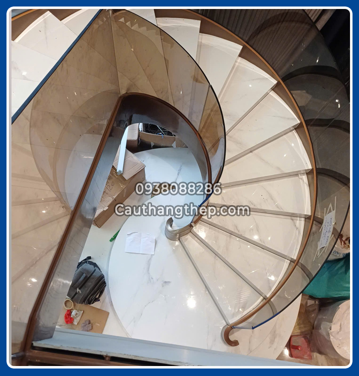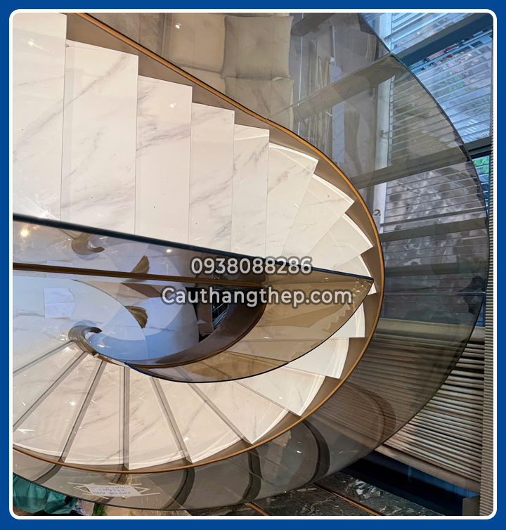 • Bước 4: Thi công lắp đặt tại công trình: Lắp trục xoắn (cột trung tâm) cố định vào nền bê tông. Gắn bậc thang theo vòng xoắn, đảm bảo độ chính xác và cân bằng. Kiểm tra độ an toàn, độ vững chắc trước khi bàn giao.